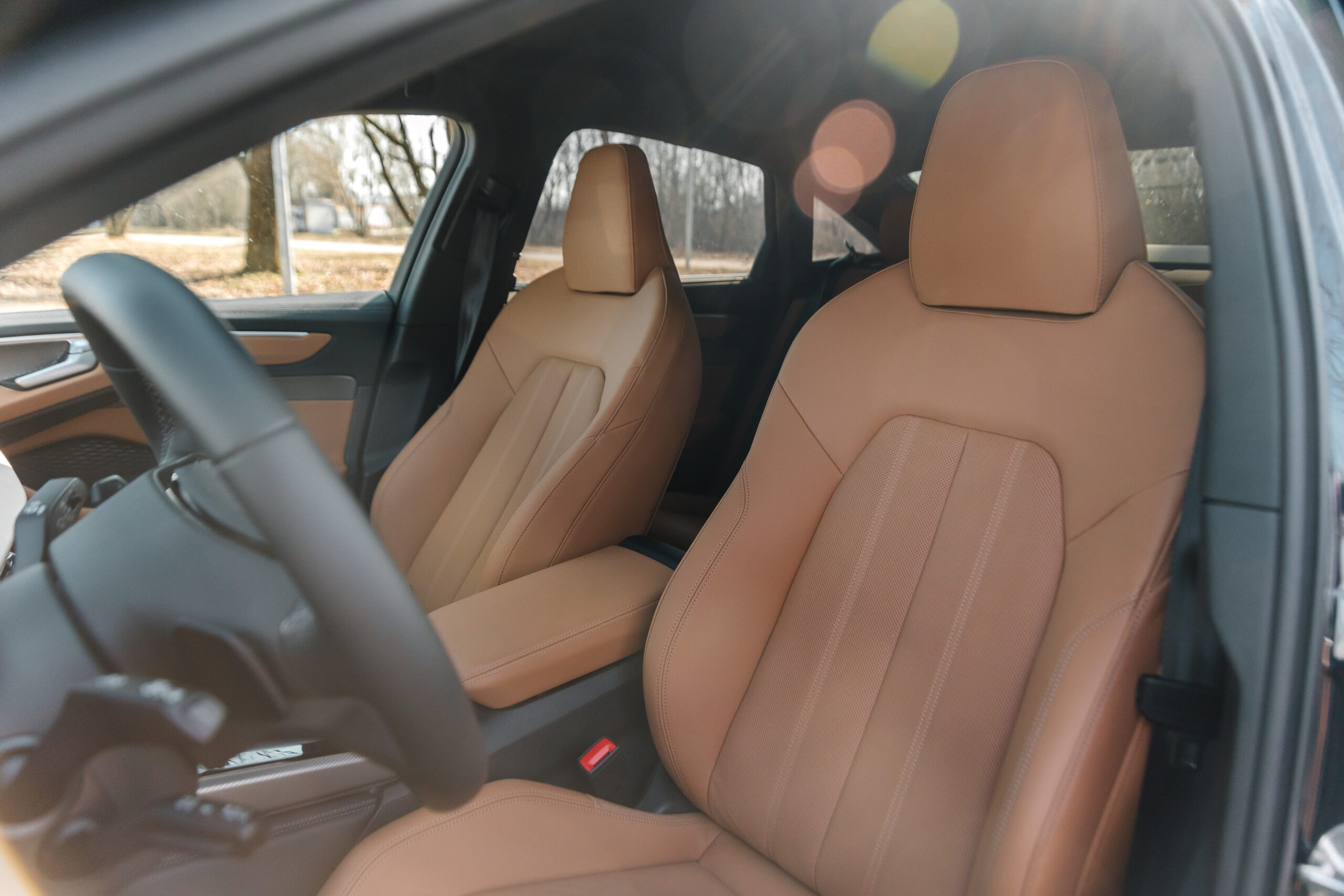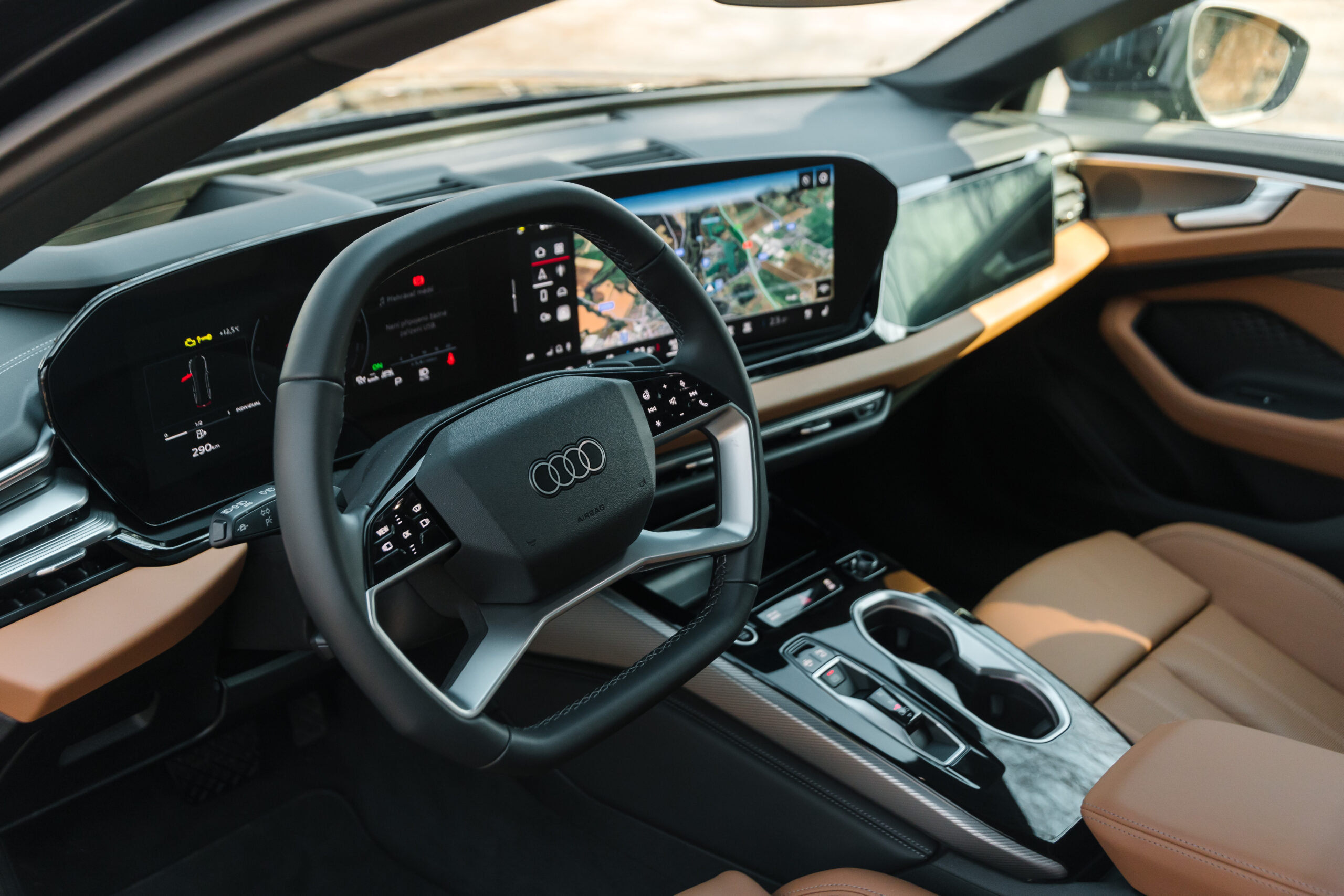 Sedadlá v Audi A6 patria presne k tomu typu výbavy, ktorá už na prvý dotyk prezradí, že toto nie je len o presune z bodu A do bodu B, ale o samotnom zážitku z cestovania. Športovo tvarované kreslá v kombinácii kože a umelej kože v hnedom odtieni pôsobia mimoriadne hodnotne a zároveň útulne. Už ich samotný tvar je navrhnutý tak, aby vodiča aj spolujazdca jemne objal, no bez toho, aby obmedzoval prirodzený pohyb. Výrazné bočné vedenie drží telo istým spôsobom v zákrutách, no stále s typickou limuzínovou noblesou – nič tu nepôsobí násilne alebo prehnane športovo.