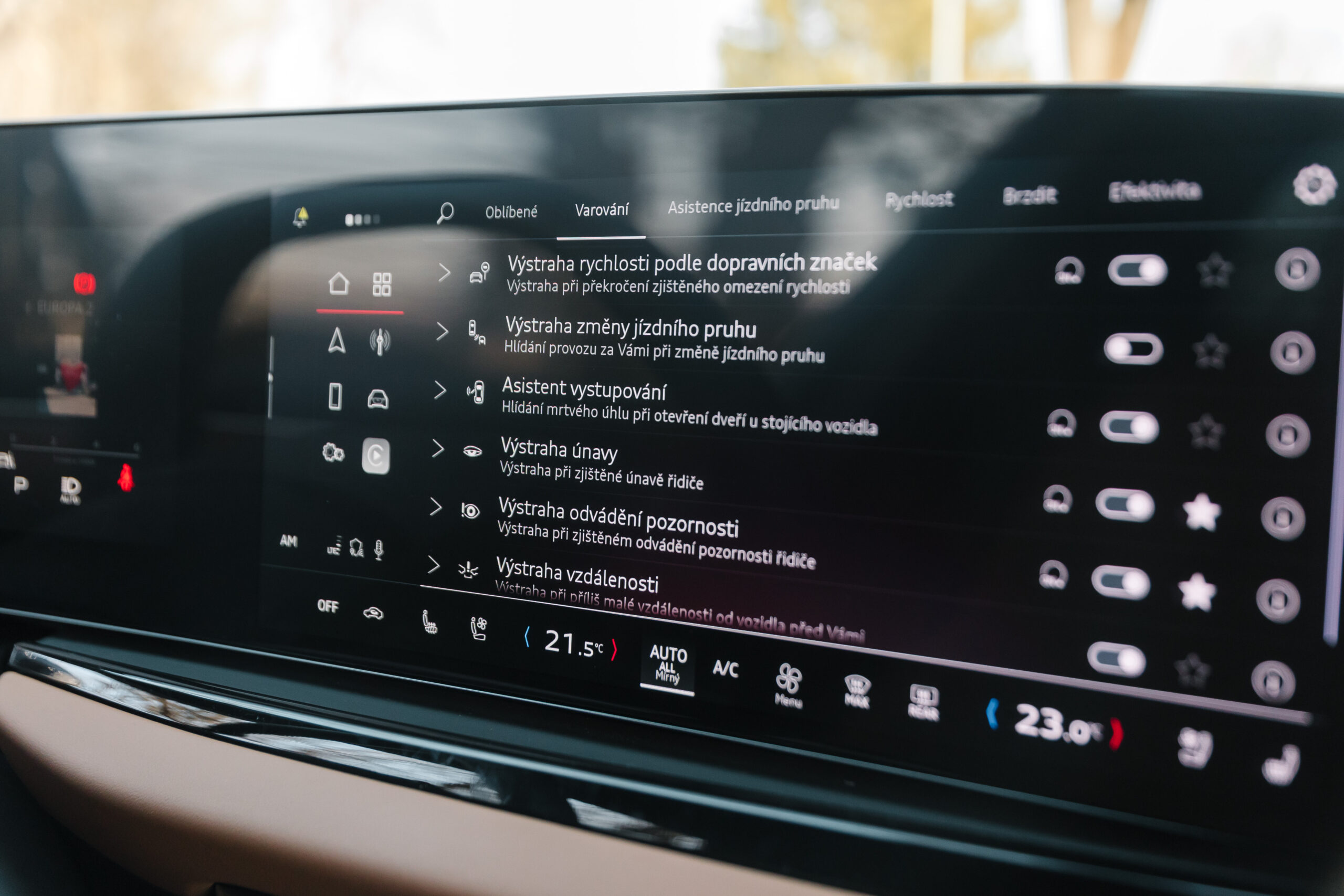 Pri parkovaní je okrem klasických parkovacích senzorov veľkým pomocníkom aj kamerový systém. Cúvacia kamera je navyše vybavená ostrekom, takže si zachováva dobrú čitateľnosť aj v nepriaznivých podmienkach, a obraz z prednej kamery si možno premietať na displeji až do rýchlosti 30 km/h. Vďaka tomu má vodič prehľad o okolí auta aj v situáciách, kde už samotný odhad rozmerov nestačí. Počas jazdy výrazne pomáha aj monitoring mŕtveho uhla, ktorý je decentne integrovaný priamo do vnútorného okraja krytu spätného zrkadla. Výstraha je dobre viditeľná, no nepôsobí rušivo – presne v duchu celkového spracovania interiéru.